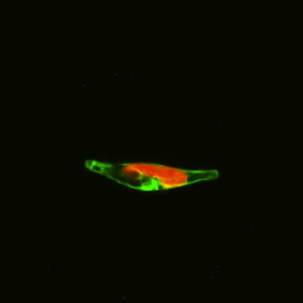 Figure 1. A genetically engineered P. tricornutum cell expressing Green Fluorescent Protein (GFP) in the cytosol (green), chlorophyll autofluorescence in the chloroplast is shown in red. (Dr Payal Patwari, SDU)